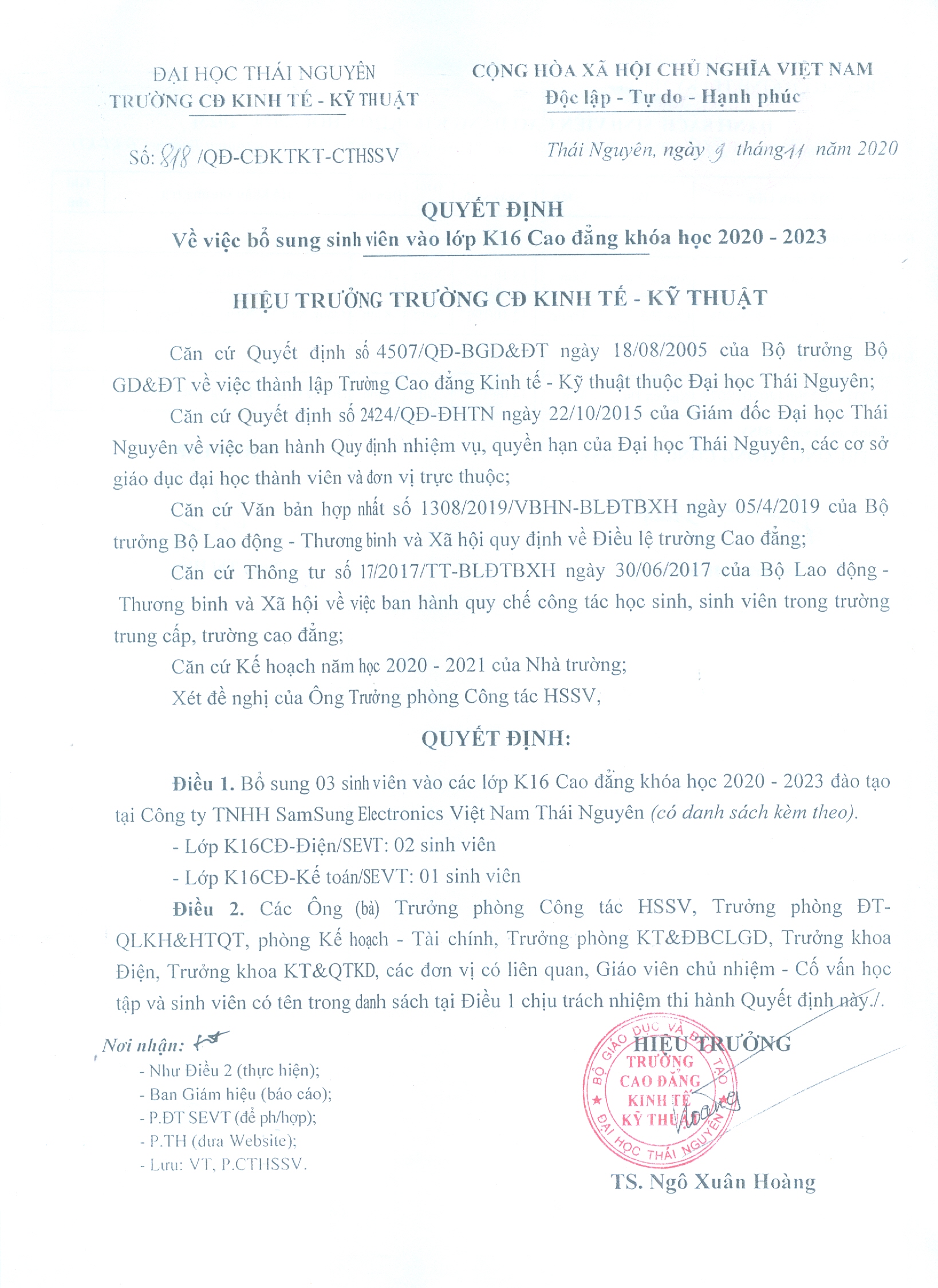 Quyết định 818 về việc bổ sung sinh viên vào lớp K16 Cao đẳng khóa học 2020 - 2023
