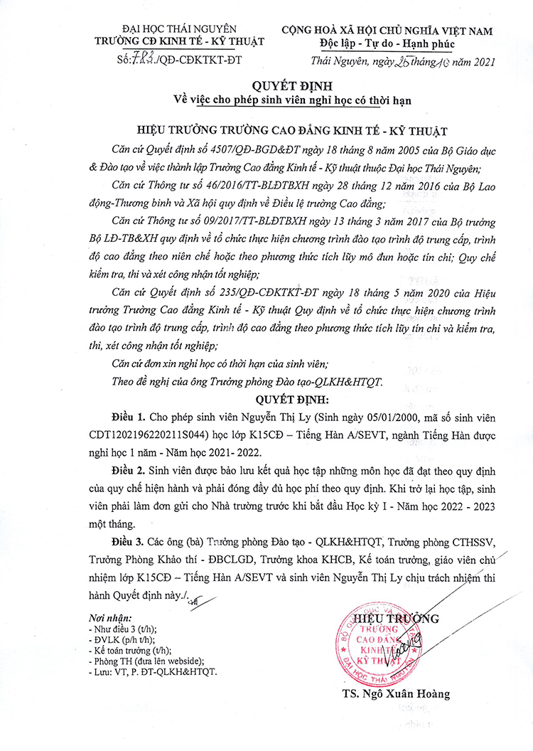 Quyết định về việc cho phép sinh viên nghỉ học có thời hạn