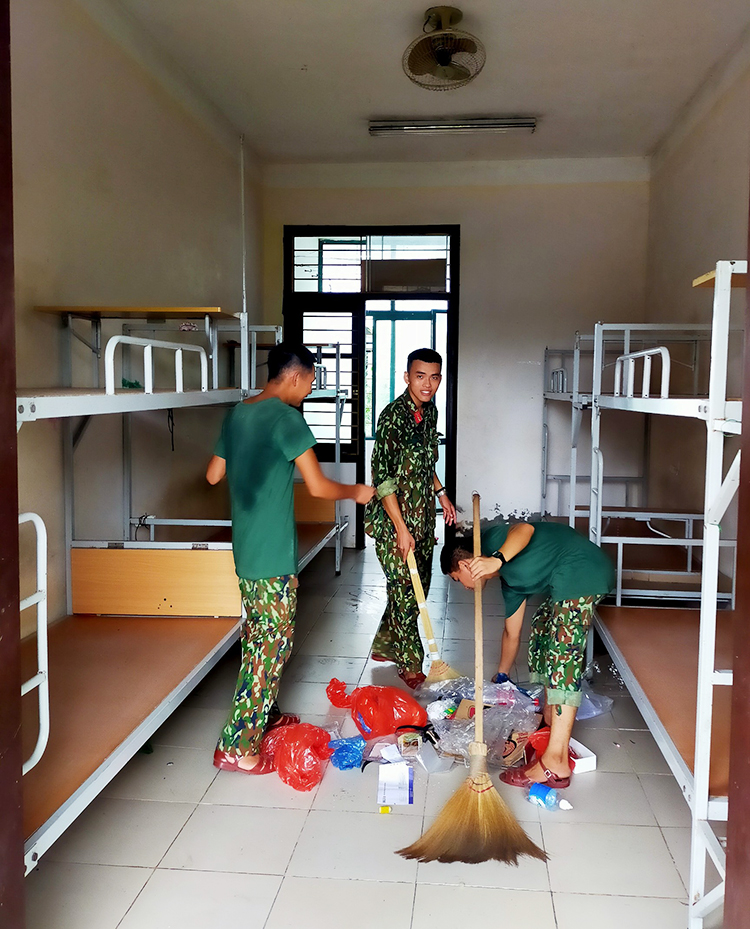 Các chiến sỹ cùng các cán bộ Nhà trường dọn dẹp, cất đồ đạc của sinh viên