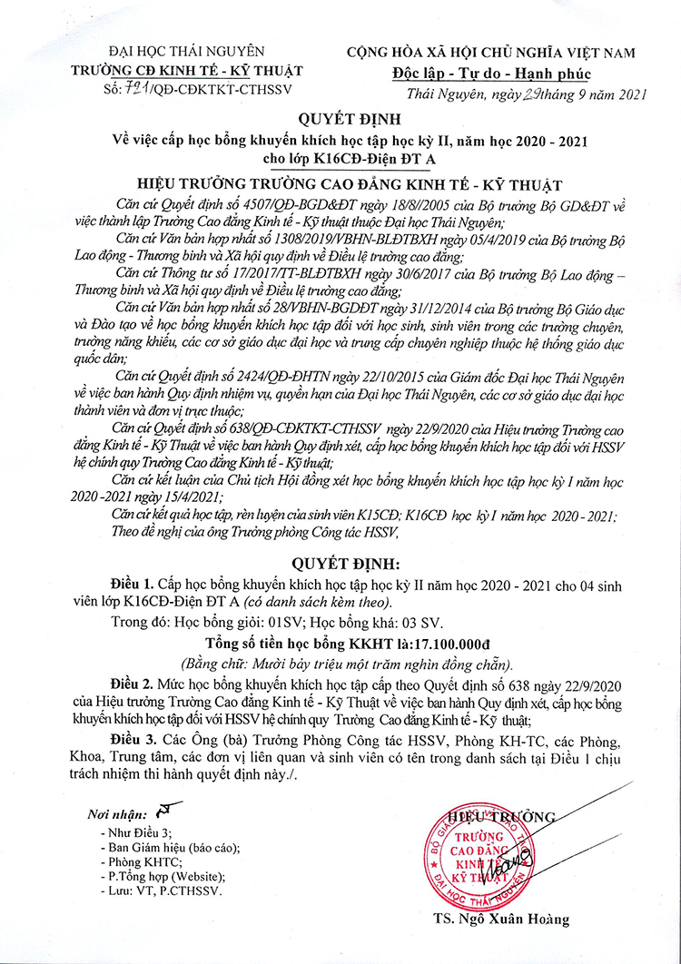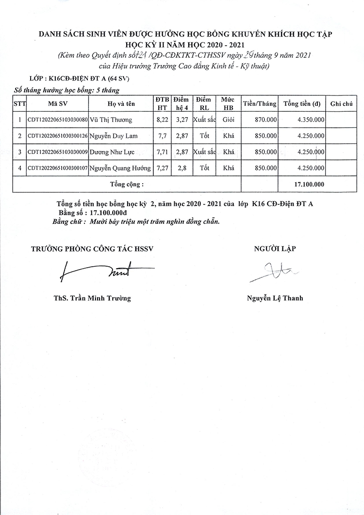 Quyết định về việc cấp học bổng khuyến khích học tập học kỳ II, năm học 2020 - 2021 cho lớp K16CĐ - Điện ĐT A