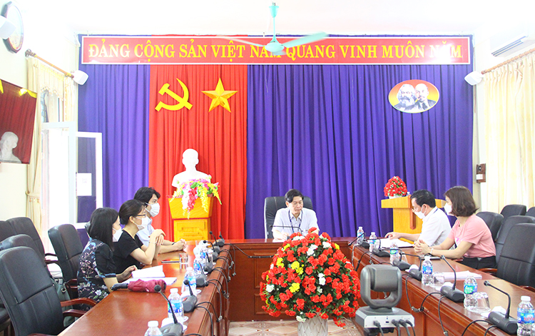 NGƯT. TS Ngô Xuân Hoàng - Hiệu trưởng và PGS.TS Nguyễn Văn Bình - Phó Hiệu trưởng, trưởng phòng Đào tạo QLKH&HTQT tiếp đón lãnh đạo Công ty TNHH Brother Việt Nam tại Phòng họp A