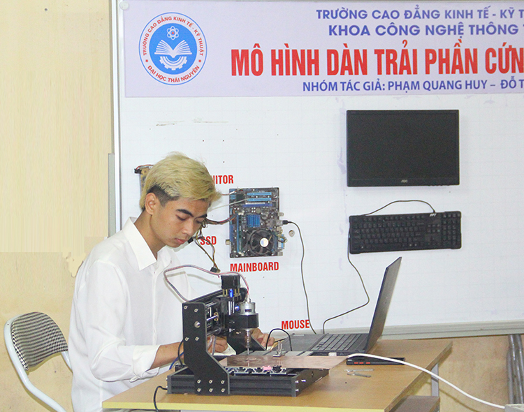 Đề tài nghiên cứu khoa học được bảo vệ lần này là đề tài “Thiết kế, chế tạo mô hình máy CNC mini khắc” của sinh viên Chu Văn Chung – lớp K16CĐ - CNTT, Giảng viên hướng dẫn – Đỗ Thái Hòa. Đề tài đi sâu vào việc nghiên cứu, thiết kế và chế tạo máy CNC tạo chữ nhằm ứng dụng vào giảng dạy, học tập và sản xuất một cách có hiệu quả tại trường Cao đẳng Kinh tế - Kỹ thuật.