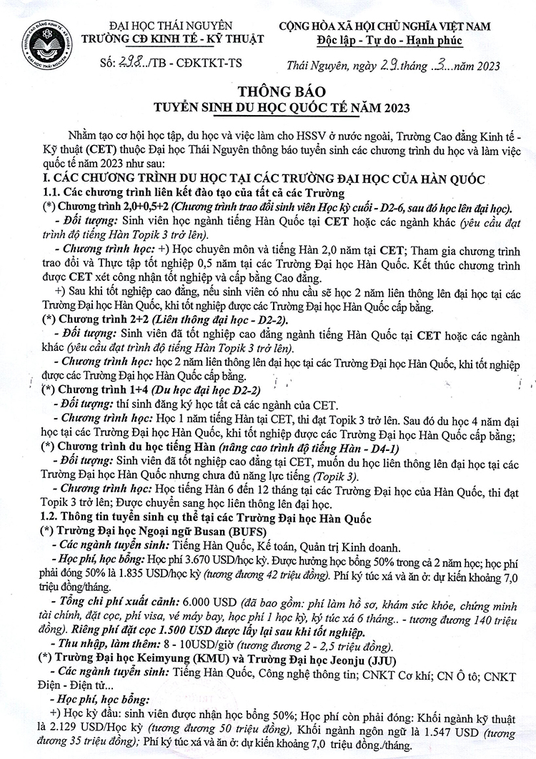 THÔNG BÁO TUYỂN SINH DU HỌC QUỐC TẾ NĂM 2023