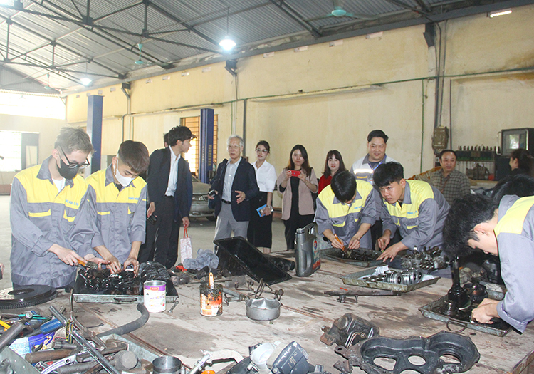 Trong buổi chiều cùng ngày, Nghiệp đoàn đã đến thăm xưởng thực hành khoa Công nghệ Ô tô, Phòng thực hành Khoa Điện và lớp học tiếng Nhật.