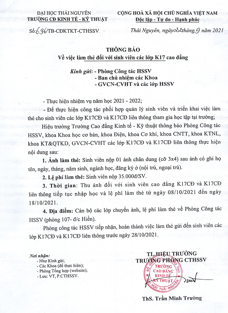 Thông báo về việc làm thẻ đối với sinh viên các lớp K17 cao đẳng