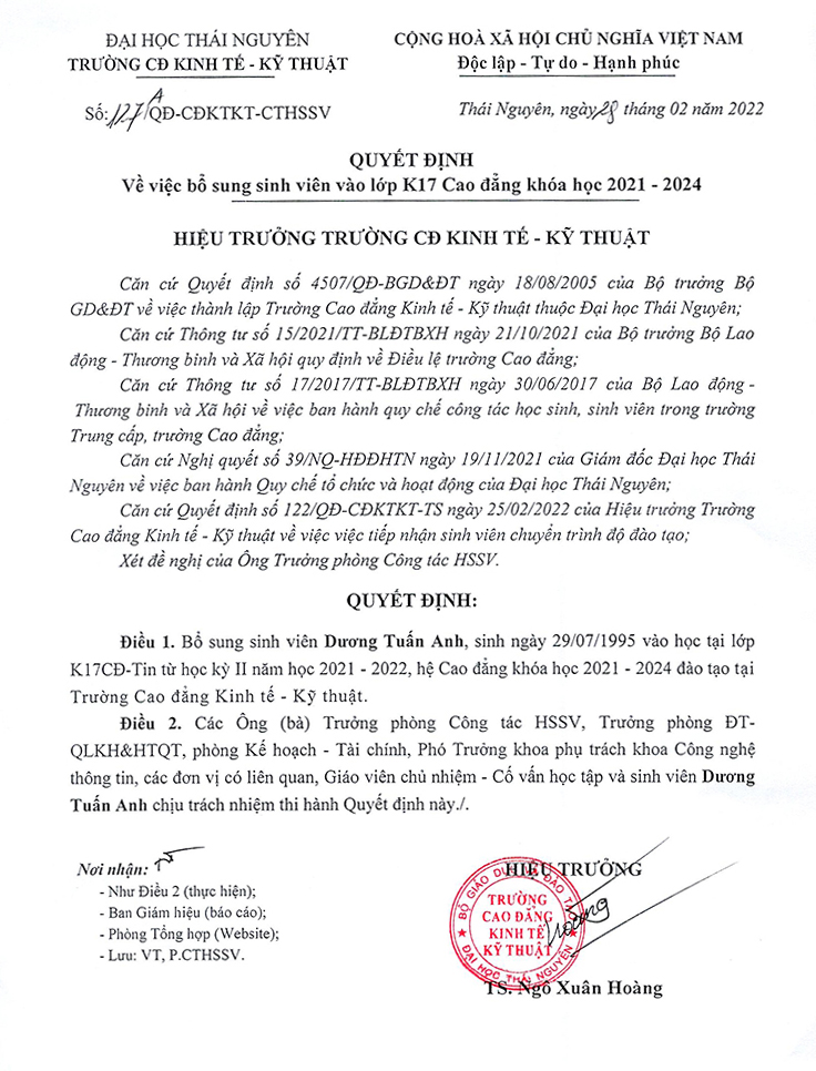 Quyết định số 127 về việc bổ sung sinh viên vào lớp K17 Cao đẳng khóa học 2021-2024