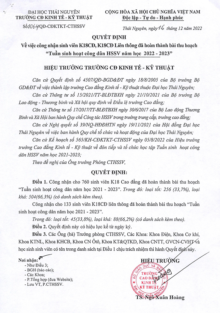 Quyết định số 1064 về việc công nhận sinh viên K18CĐ, K18CĐ Liên thông đã hoàn thành bài thu hoạch Tuần sinh hoạt công dân HSSV năm học 2022-2023