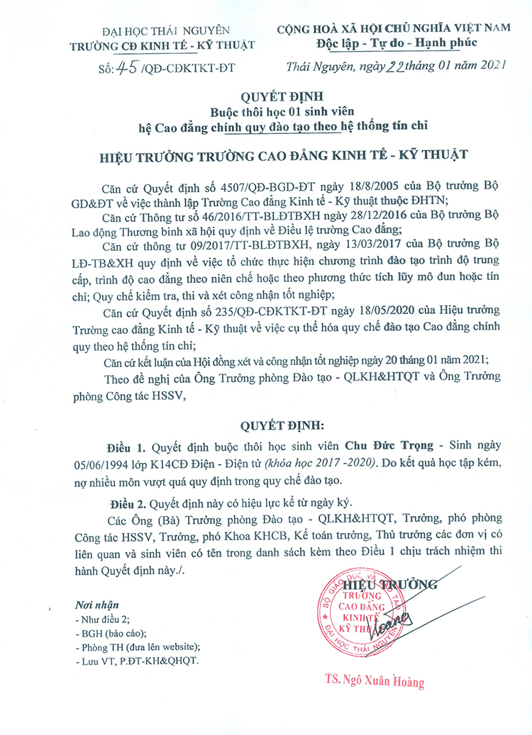Quyết định số 45 về việc buộc thôi học 01 sinh viên hệ Cao đẳng chính quy