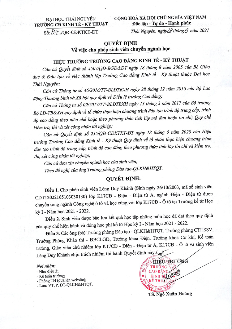Quyết định về việc cho phép sinh viên chuyển ngành học