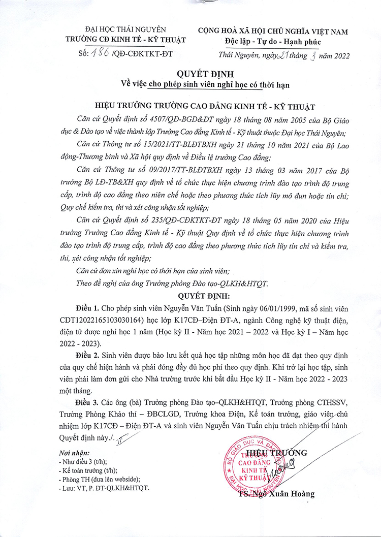 Quyết định số 186 về việc cho phép sinh viên nghỉ học có thời hạn