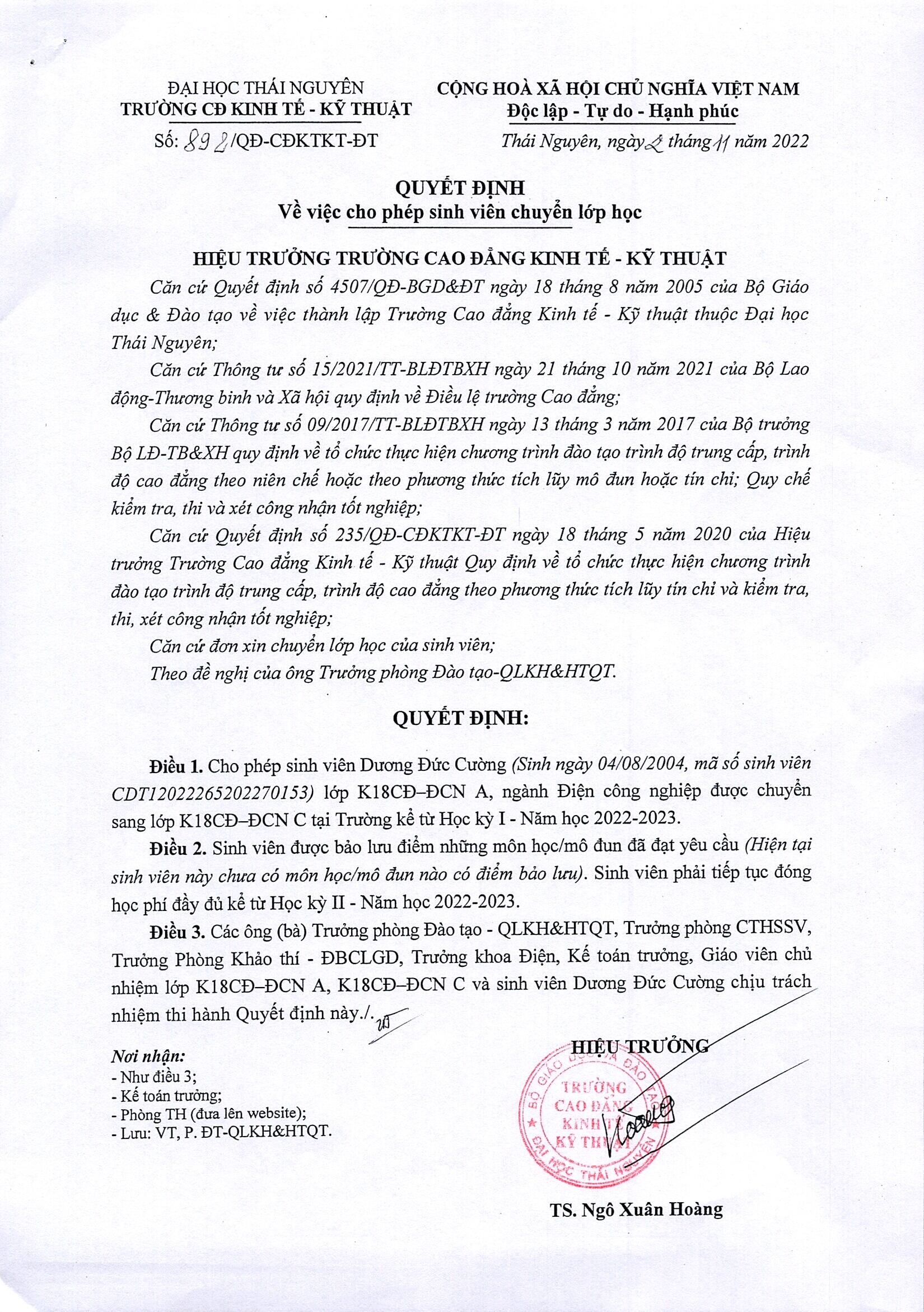 Quyết định số 892 về việc cho phép sinh viên chuyển lớp học